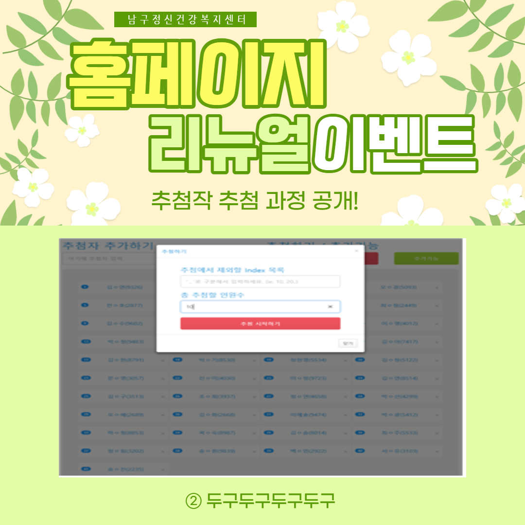 ④ 추첨작 선정은 홈페이지 리뉴얼 이벤트 '마음건강놀이터' 응모자 대상(전화번호 미기입자, 우수작 선정자 제외)으로 무작위추첨으로 10명을 선발했습니다.