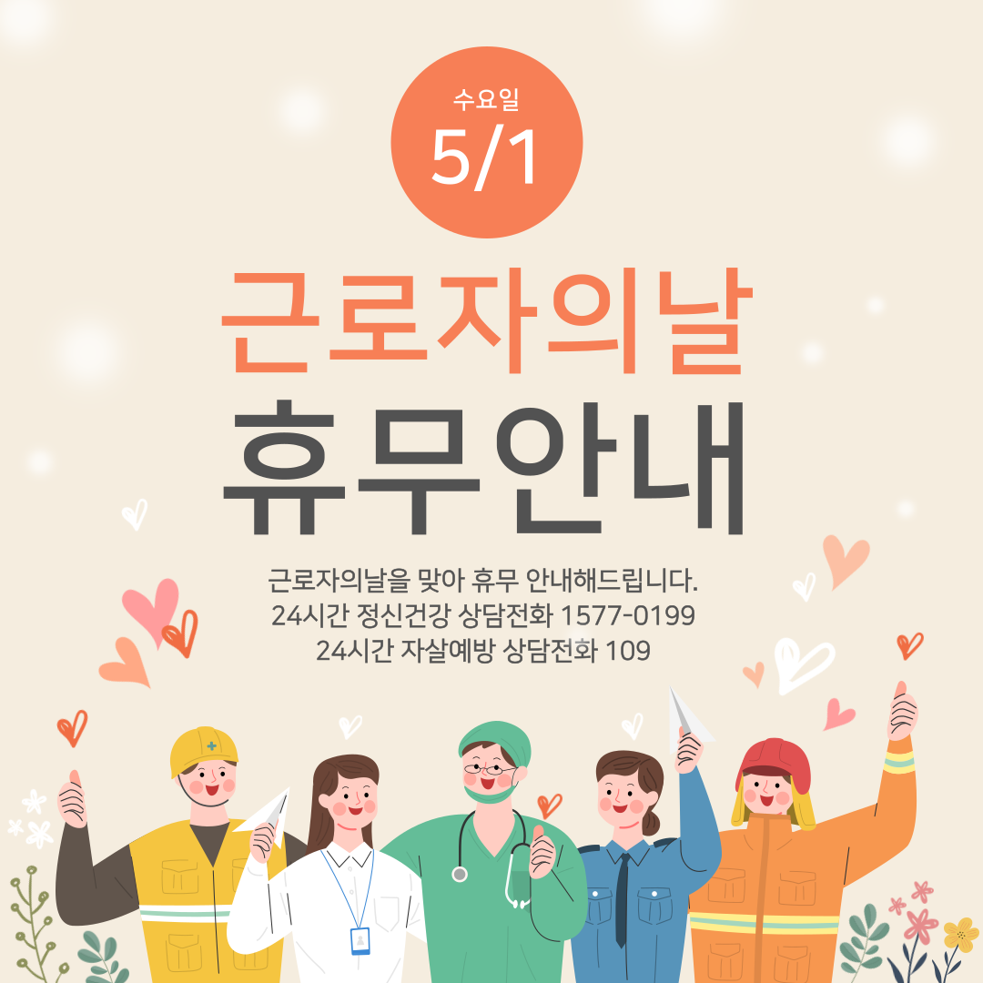 2024년 5월1일(수) 근로자의 날 휴무 안내 페이지 정보 작성자 남구정신건강복지센터 댓글 0건 조회 25,956회 작성일 24-04-29 14:37 목록 본문 이전글부산 남구정신건강복지센터 직원 채용 공고(채용 완료) 24.05.13 다음글부산중독관리통합지원센터 세미나 개최 안내 24.04.29 댓글 0 댓글목록 등록된 댓글이 없습니다.